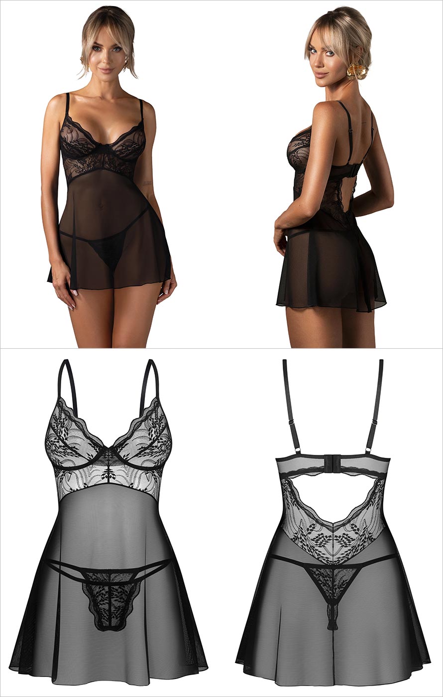 Erliegen Sie der bezaubernden Eleganz dieses Obsessive Perisia Babydolls, einem zarten Stück, das die Silhouette mit Leichtigkeit betont. Die Feinheit der Spitze verbindet sich mit der luftigen Transparenz des Tülls zu einem unwiderstehlichen Spiel der Materialien. Ausgestattet mit vorgeformten Bügel-Cups für perfekten Halt und begleitet von einem passenden String, vereint dieses rückenfreie Negligé Komfort, Sinnlichkeit und Raffinesse.