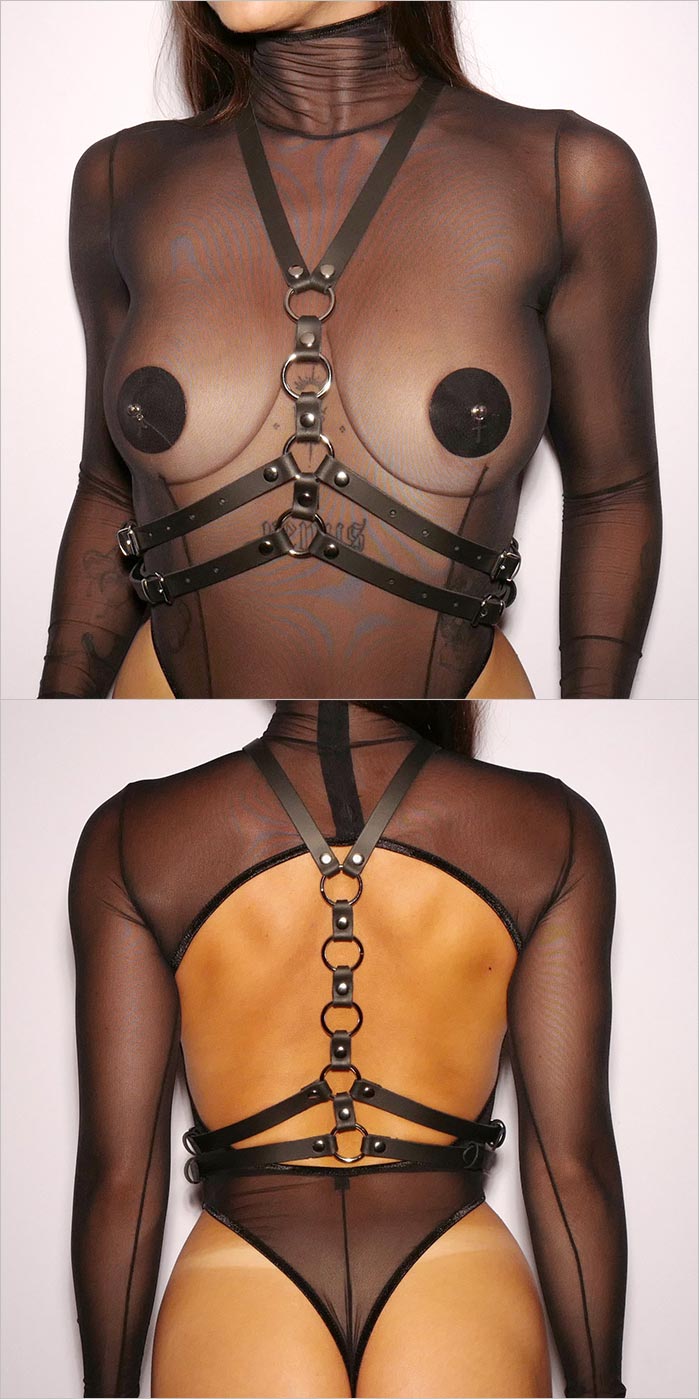 Verleihen Sie Ihrer Silhouette eine kühne und elegante Ausstrahlung mit diesem Brustgeschirr mit 9 Ringen von The Sinners. Dieses Accessoire aus schwarzem Leder wurde entworfen, um den Körper charakterstark in Szene zu setzen. Die feinen, verstellbaren Riemen umschließen die Taille und betonen die Kurven, während die silberfarbenen Metallverbindungen einen raffinierten Fetisch-Akzent setzen. Vielseitig tragbar, lässt sich das Geschirr direkt auf der Haut, mit verführerischer Lingerie oder als bewusstes Stilstatement im Alltag kombinieren.