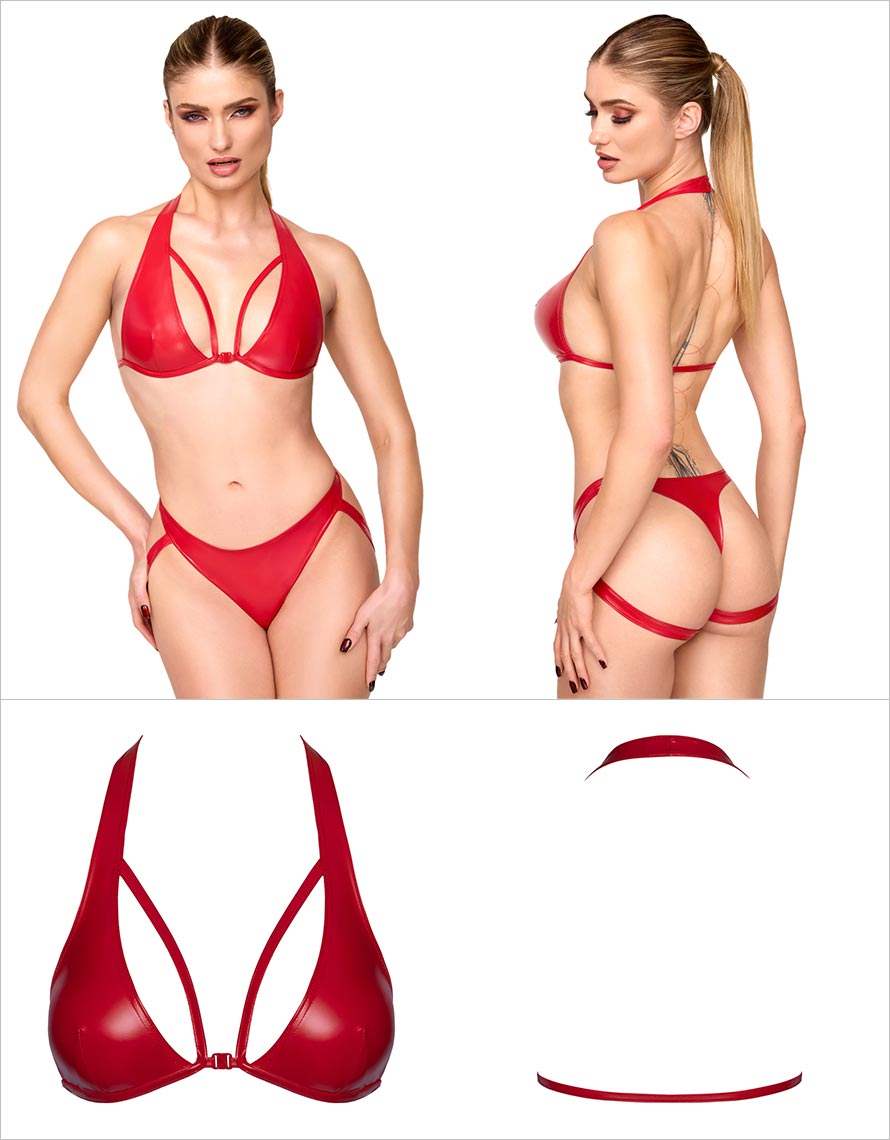 Somptueux soutien-gorge Noir Handmade Troublemaker F392. Conçu en tissu effet mouillé de couleur rouge. Avec lanières soulignant divinement la poitrine.