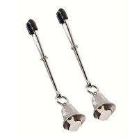 Pinces à seins style brucelles, réglables et agrémentées d'une petite clochette. Les clochettes argentées sonnent selon vos mouvements. L'extrémité des pinces est recouverte de petits fourreaux en caoutchouc souple.