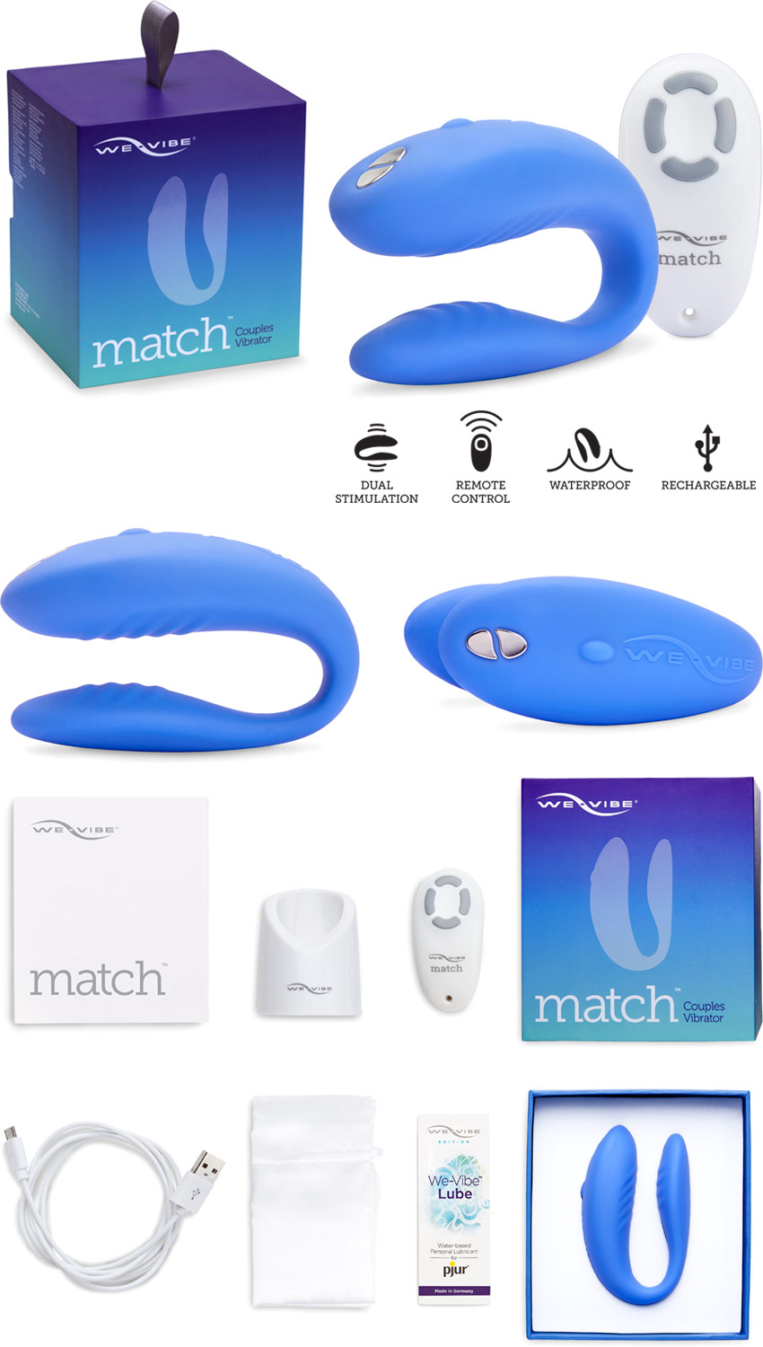 We-Vibe Match est la dernière évolution du célèbre sextoy "We-Vibe", conçu pour les couples. Il s'utilise durant les rapports sexuels et permet d'augmenter le plaisir des deux partenaires, en stimulant clitoris, point G et pénis. Ce modèle, plus évolué que le We-Vibe Unite, dispose d'un design ergonomique et fin, d'une puissance ajustable ainsi que d'une conception étanche. Il est fourni avec une station de recharge et sa télécommande permet de choisir l'intensité et les modes de vibrations.